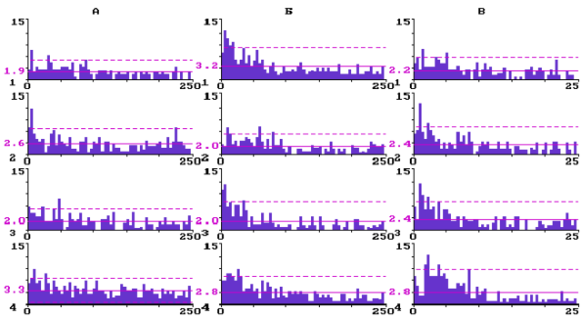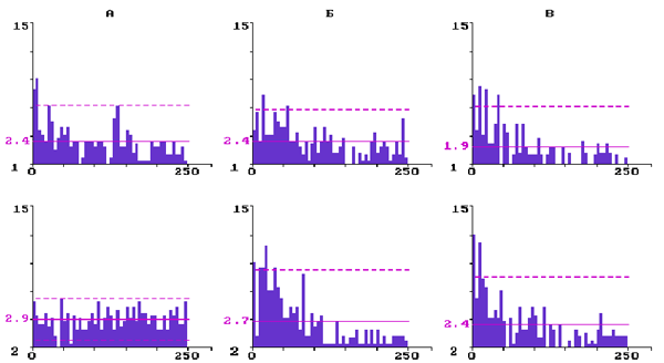 На рис. 3 представлены ГМИ фоновой импульсной активности трех нейронов, принадлежащих бочонковой колонке С3. Нейрон на (А) имел до введения резерпина три отчетливых максимума в ГМИ, что свидетельствует о наличии в структуре его исходного разряда пачек и групп, перемежающих аритмично следующие единичные разряды. Через 2,5 ч после введения резерпина частота импульсации