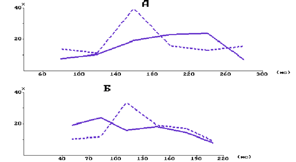 А - при выработке мигательного УР в контроле; В - в последействии резерпина. Сплошная линия - при изолированной тактильной стимуляции; пунктирная - при подкрепляемом предъявлении УС. По вертикали - количество значений длительности тормозной паузы в %; по горизонтали - длительность тормозной паузы в мс.
