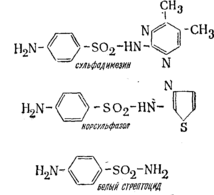 В медицине используется как элементарная сера, так и ее соединения. Например, мелкодисперсная сера—основа мазей, необходимых для лечения различных грибковых заболеваний кожи. Все сульфамидные препараты, (сульфидин, сульфазол, норсульфазол, сульфодимезин, стрептоцид и др.) —это органические соединения серы, например: