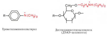 Ионообменная хроматография. Ионообменные смолы являются полимерными органическими соединениями, содержащими функциональные группы, способные вовлекаться в ионный обмен. Различают положительно заряженные анионообменники, представленные органическими основаниями и аминами, и отрицательно заряженные катионообменники, содержащие фенольные, сульфо- или карбоксильные группы. Из сильно- и слабоосновных анионообменников чаще используют производные полистирола и целлюлозы, несущие функциональные группы: