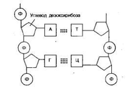 Рис 1.2. Фрагмент молекулы ДНК (между А—Т— две водородные связи; между Г—Ц — три водородные связи).