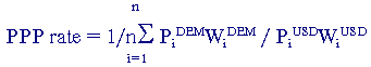 где РiDEM и PiUSD - цены соответветственно в немецких марках и долларах США на товары и услуги в Германии и США, входящие в стандартную корзину промышленного и частного потребления этих стран; Wi - доля этих товаров и услуг в структуре промышленного и частного потребления (в ВНП или национальном доходе); n - количество товаров, включенных в корзину.Чем значительнее выборка, тем более репрезентативен результат валютного курса.