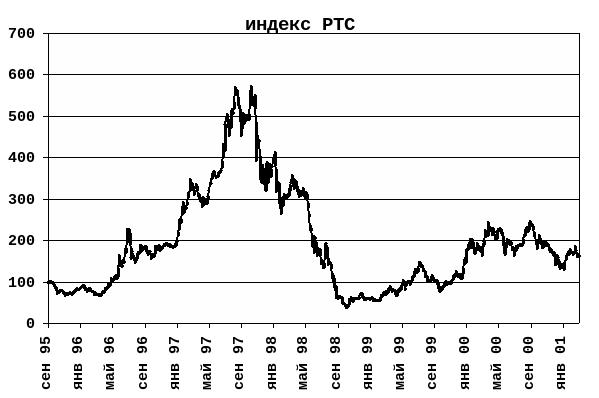 Летом 1995 года на смену ПОРТАЛ пришла Российская торговая система (РТС), и вскоре ее терминалы появились в других городах страны. Первоначально в РТС твердо котировались акции семи эмитентов, а сама система связывала в единую сеть четыре крупных внебиржевых рынках страны: Московский, Санкт-Петербургский, Новосибирский и Екатеринбургский. 1 сентября 1995 года впервые был рассчитан Индекс РТС (рис.1.1), официальный индикатор Биржи, который и на сегодняшний день является основным показателем развития российского фондового рынка. Индекс рассчитывается каждые полчаса в течение всей торговой сессии на основании данных о сделках, заключенных в РТС с наиболее ликвидными акциями. Индекс РТС обновляется в режиме реального времени и публикуется на WEB-сервере РТС.