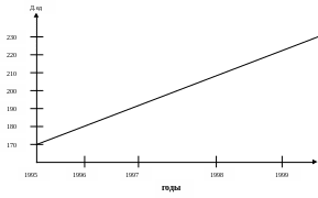 Пример 2. Составить прогноз объёма платных услуг в фирме на 2002 и 2003 гг. Известно, что в 1995 г. объём платных услуг в фирме составлял 207 денежных единиц ( д. ед.), а в 2001 г. – 228 д. ед. в сопоставимых ценах. Сложившиеся условия работы фирмы существенно не изменяется.