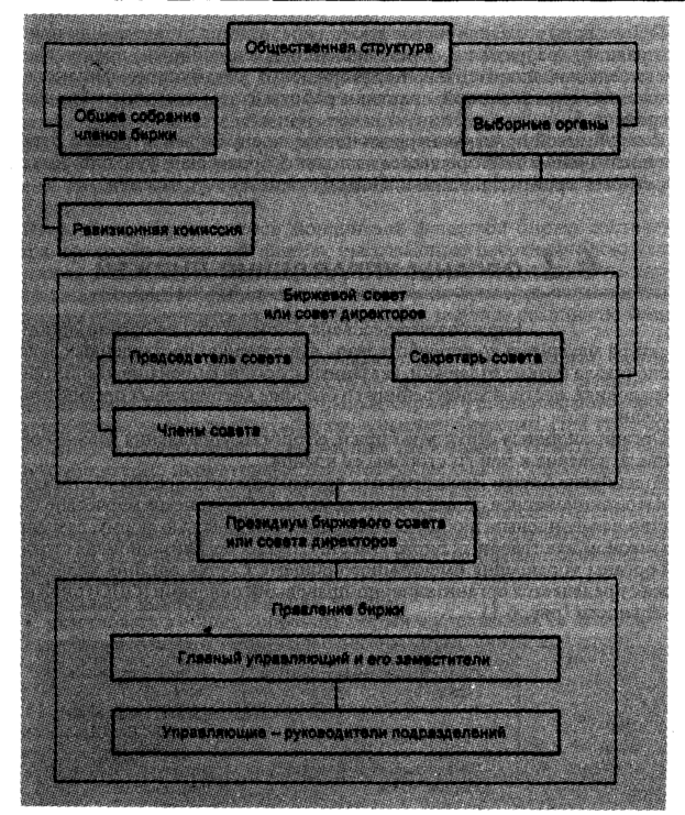 Представленная схема (см. рис. 6.1) показывает, что органы управления биржи включают общественную и стационарную структуры.