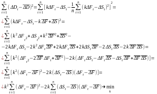 Попытаемся решить оптимизационную задачу, то есть найти такое k, при котором вариация изменения портфеля “D”, содержащего k длинных фьючерсных позиций и одну спотовую была бы минимальной: