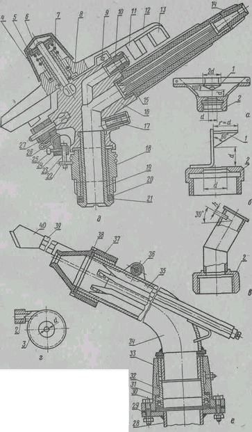 1—дефлектор; 2 — корпус; 3—верхняя Крышка; 4 — колпачок; 5 — фиксатор; 6 — штифт; 7—пружина; 8—фторопластовая шайба; 9 — упор: 10 — сопло; 11 и 13 — лопатки; 12 — коромысло; 14 — сопло; 15 — ствол; 16 — корпус; 17 — сопло; 18 — основание; 19 — стакан; 20—резиновая шайба; 21—фторопластовая шайба; 22—упорное кольцо; 23— стержень; 24 — рычаг; 25 — стопорный винт; 26—пружина; 27—упор; 28—фланец; 59 и 38 — прокладки; 30 — манжета; 31 — упорная шайба; 32 — втулка; 33 — корпус; 34 — ствол; 35 — выпрямитель; 36 — ось коромысла; 37 — сопло; 39 — коромысло; 40 — лопатка.