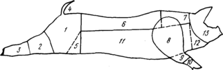 1,2 — тазобедренная часть (задний окорок); 3— задняя ножка; 4— хвост; 5 — пашина; 6 — корейка; 7 — лопаточная часть; 8, 9 — передний окорок; 10 — передняя ножка; 11 — грудобрюшная часть; 12, 13 — шейная часть.
