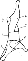 1— подгривный жир с мышечной тканью; 2 — спинореберная часть; 3— верхний слой мышечной ткани с подкожным жиром из крестцовой части; 4 — задняя ножка с поясничной частью; 5 — жировые отложения брюшины; 6 — лопаточная и шейная части.