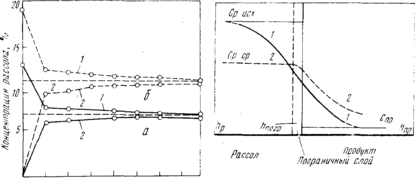 Рис. 2.10. Изменение концентрации соли в рассоле, пограничном слое и мясе при мокром посоле.