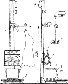 Один из путей совершенствования методов обвалки и жиловки при производстве колбасных изделий — переход на вертикальную обвалку (рис. 2.8). Вертикальная обвалка полутуш, разработанная на Киевском мясокомбинате, является прогрессивной и имеет ряд преимуществ по сравнению с горизонтальной обвалкой, в том числе с точки зрения более быстрого получения парного бескостного мяса. Этому же способствует односортная жиловка и немедленное тонкое измельчение мяса, совмещенное с посолом.