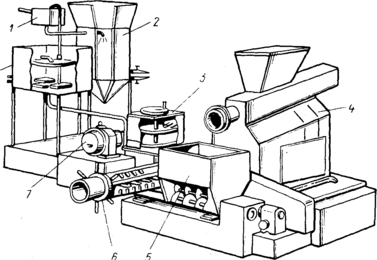 Широкое распространение получил посолочный агрегат (рис.2.11), в состав которого входит волчок, дозаторы сухих посолочных веществ или их растворов и мешалка (периодического или непрерывного действия). В случае применении рассола он может подаваться непосредственно в область режущего механизма волчка, в шнековый смеситель, устанавливаемый на выходе из волчка, или в мешалку. При ускоренном посоле (6 ч) мяса для вареных колбас его измельчают на волчке до размеров частиц 2...3 мм и смешивают с насыщенным холодным (10...12°С) рассолом (10% к массе сырья).