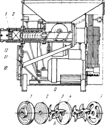 Мясо для полукопченых и копченых колбас после посола измельчают на волчке (рис. 2.12). Режущий механизм волчка состоит из чередующихся решеток и ножей. Неподвижная решетка и вращающийся крестообразный нож (односторонний или двусторонний) образуют плоскость резания. Число таких режущих плоскостей может быть различное (1...4 шт.) в зависимости от степени измельчения: чем больше степень измельчения, тем больше должно быть число плоскостей резания. При небольшой степени измельчения (диаметр отверстий 16...25 мм) достаточно одной плоскости резания, при большой (диаметр отверстии 2...3 мм) — число плоскостей резания следует доводить до четырех.