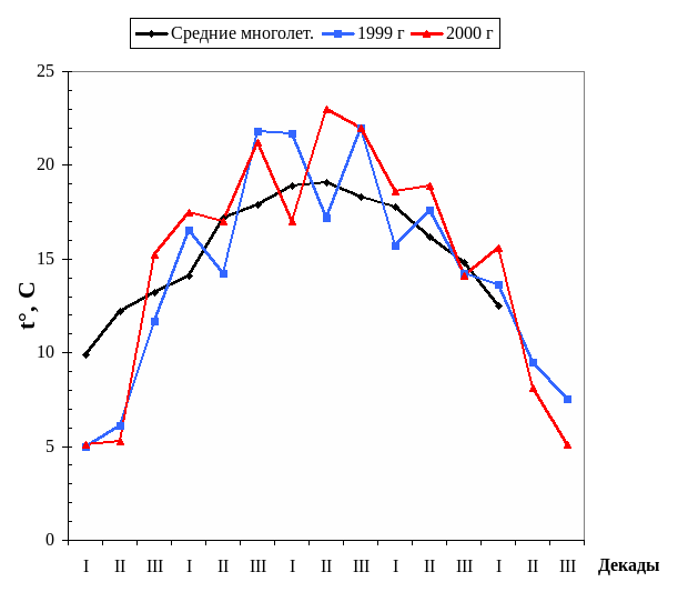 Июнь 2000 года характеризовался несколько повышенными показателями температур (17-21С), чем средние многолетние данные (14 - 18С) прил.2, рис.3). В июле температура была достаточно высокой, особенно во II и III декаде - 23С и 22С соответственно (рис.3). Август был теплым, по сумме температур ( 51,6С ) превышал средне-многолетнюю сумму температур ( 48,8С ) (прил.2).