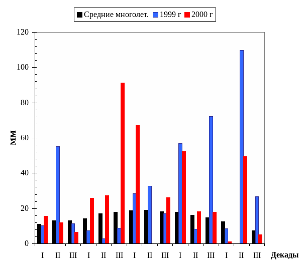 Распределение осадков за лето 2000 года существенно отличалось от предыдущего года исследования. Если в 1999 году самым “влажным” месяцем был август (137,2мм ), то в 2000 году такое название заслужил июнь, особенно III декада (91,3мм ), в котором среднемесячное количество осадков составило 144,3мм, что в 3 раза больше среднихмноголетних показателей (прил.2, рис.4). Самой засушливой за лето 2000 года была II декада июля. В этот период вообще не было осадков (прил.2,рис.4). В августе сумма осадков составляла 88,2мм, что превышало среднемноголетние данные – 60мм (прил.2).
