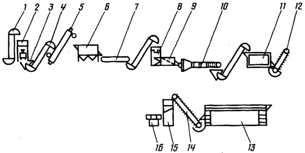 1, 4, 12, 13, 14 - транспортеры; 2 — автоматические весы с бункером-накопителем; 3 — загрузочная ванна; 5 — паровая очистительная машина; 6 — моечная машина; 7 — инспекционный транспортер; 8 — резательная машина; 9 — сортировочная машина; 10 — бланширователь; 11 — охладитель; 13 — скороморозильный аппарат; 15 — бункер-накопитель; 16 — фасовочный автомат.