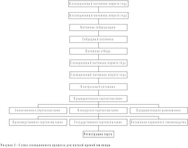 В селекционном процессе используется схема уже ставшая традиционной. Данная схема применяется во многих селекционных учреждениях страны [36]и включает в себя следующие питомники: коллекционный питомник первого и второго года, питомник гибридизации, гибридный питомник, питомник отборов, селекционный питомник первого года, селекционный питомник второго года, контрольный питомник, питомник конкурсного сортоиспытания. Отбор гибридного материала ведётся методом педигри. Ввиду разнообразия исходного материала и различной степени его изученности вовлечение исходного материала в схему селекционного процесса происходит на разных этапах. Малоизученный материал включается в схему начиная с коллекционного питомника. Хорошо изученный материал включается в схему начиная с питомника гибридизации.