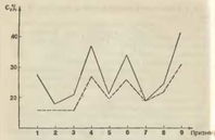 На рис. показаны кривые величин коэффициента вариации экстерьерных признаков этих двух групп, отражающие имеющиеся различия.