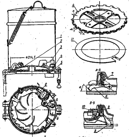 На рисунке 1 показана конструкция дискового высевающего аппарата кукурузных квадратно-гнездовых сеялок CКHK-8 и СКНК-6. Высевающий аппарат состоит из семенной банки емкостью 13 дм 3, корпуса-дна 2 с накладкой 3, под которой смонтированы отражатель 6 и выталкиватель 8 семян, и откидного дна 5. Высевающий диск 4 размещен между корпусом-дном и откидным дном. При установке в аппарат диска толщиной 7 мм между ним и откидным дном для компенсации зазора устанавливают кольцо: толщиной 1 мм, а при установке диска толщиной 6 мм укладывают кольцо 11 толщиной 2 мм.