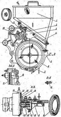 1 — бункер; 2 — чистик отражателя; 3 — накладка; 4 и 20 — крышки; 5 — корпус; 6 — высевающий диск; 7— выталкиватель; 8 — штырь; 9 — шестерня z = 90; 10 — ось; 11 — масленка; .12 — шестерня z = 40; 13 — отражатель семян; 14 — вал-шестерня; 15 — обойма сальника; 16 — втулка; 17 — стакан; 18 — ось шестерни; z = 40; 19 — цепь.