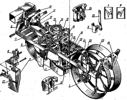 1, 5 и 22 —звёздочки; 2 — гнездообразующий клапан; 3 — сошник; 4 — туковая воронка; 6 — гнездообразующий клапан туковой воронки; 7 и 12 — тяги подвески; 8 — кронштейн подвески; 9 и 10 — валы механизма распределения; 11 — вилка; 13 — тяга механизма распределения; 14 — шестерня z = 40; 15 — двуплечий рычаг; 16 — кронштейн сошника; 17 — коромысло; 18 — толкатель; 19 — сектор; 20 — замок; 21 — рамка колеса; 23 — колесо; 24 — чистик; 25 — тяга гнездообразующего клапана; 26 — делитель семян; 27 — тяга тукового клапана.