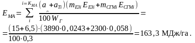 | ЕМА | — | повна енергоємність МА, амортизованих під час вирощування та збирання ПР, МДж/га; |