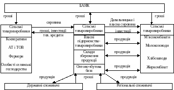 У кооперативних фінансово-промислово-аграрних спілках буде відбуватися в єдиному комплексі відтворення, нагромадження, концентрація й оборот фінансового, виробничого і товарного капіталів, їх інвестування в пріоритетні галузі АПК, що являє собою принципову новизну пропонованих рішень у період переходу до цивілізованих ринкових відносин. Модель взаємозв’язків ОСГ із сільгоспвиробниками, підприємствами переробки і споживачами подана у вигляді схеми на рис. 2.