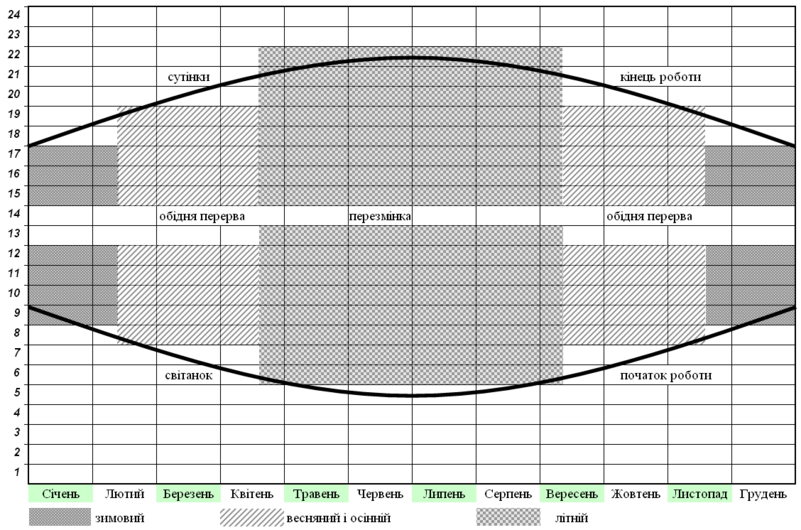 | День | Початок зміни | Перезміна | Кінець зміни |