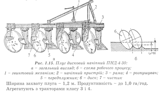 Плуг дисковий начіпний ПНД-4-30 (рис. 1.15) призначений для оранки перезволожених ґрунтів на глибину до ЗО см. Плуг складається з чотирьох сферичних дисків 6 діаметром 710 мм, чотирьох передплужників 5, розпушувачів 4, опорного колеса з гвинтовим механізмом 1, рами 3 та начіпногопристрою 2.