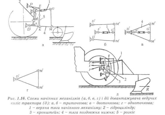 При агрегатуванні начіпних плугів з тракторами класу 3 начіпний механізм трактора налагоджують на двоточкову схему (рис. 1.16, в). У цьому випадку передні кінці обох нижніх поздовжніх тяг закріплюють в одній точці внизу на поперечній осі механізму.