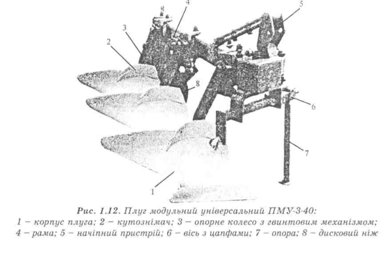 Плуг ПМУ-3-40 (рис. 1.12) складається з рами 4, трьох корпусів 1 з кутознімачами 2, начіпного пристрою 5, підпружиненого дискового ножа 8, опорного колеса 3 з гвинтовим механізмом і механізму регулювання ширини захвату.