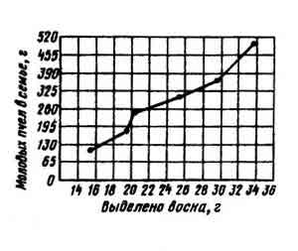 Кроме того, установлено, что количество воска, выделенного за один и тот же промежуток времени, пропорционально количеству молодых пчел в семьях (рис. 2).