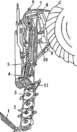 1 — полевой делитель; 2 — кронштейн; 3 — режущий аппарат; 4 — механизм уравновешивания; 5 — подрамник; 6 — стойка; 7 — гидрооборудование; 8 — рама навески; 9 — тяговый предохранитель; 10 - механизм привода; 11 — носок.