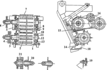 19 - натяжное устройство; 20 - ось; 21 - блок-звездочка.