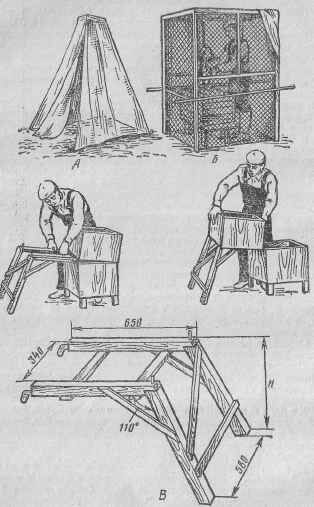 Палатки для осмотра пчел: А - складная марлевая; Б - из металлической сетки; В - переносной столик для работы с двухкорпусными ульями (размеры, мм).