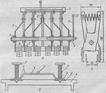 Приспособления для осмотра гнезд ульев: А-гнездовыниматель ульев В.Г. Шахова; Б - рамкодержатель РД-1; В - рамкояподъемник В.И. Сапрыкина (размеры, мм)