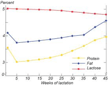 В начале и в конце лактации содержание жира и протеина выше по сравнению с серединой лактации (см. Картинка ниже).