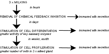 Частое доение имеет долгосрочный и краткосрочный эффект. Краткосрочный эффект заключается в повышении надоев из-за активизации деятельности секреторных клеток, а долгосрочный эффект заключается в повышении количества синтезируемого в вымени молока ввиду увеличения количества секреторных клеток. Последнее подтверждает, что возможно влиять на количество секреторных клеток вымени в течение периода лактации, что в свою очередь влияет на объем произведенного молока. (см. Картинку ниже).