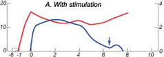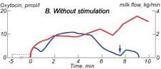 Эффект от преддоильной стимуляции перед доением в течение одной минуты на средний уровень окситоцина (красная линия) и молокоотдачу (синяя линия) во время доения. Молокоотдача началась сразу в момент «0»; стрелки показывают начальное время выделения (Майер и Дж. Эндокринол, 103:355, 1984 г.)