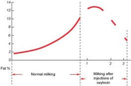 Эффективное извлечение молока – один из важных моментов, связанных с техникой и процедурами доения. Для этого есть много причин. Эффективное извлечение молока влияет на надои. При этом также оказывается воздействие на состав молока, в частности на содержание жира. Если фермеру платят в зависимости от содержания жира в молоке, важно опорожнять вымя как можно более полно, так как последняя порция молока имеет самое высокое содержание жира (см. Картинку внизу). Наши собственные исследования показали, что содержание жира в таком молоке может составлять от 15 до 20%.