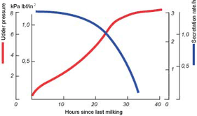 Принимая во внимание сказанное чуть выше, следует, что давление в вымени является не единственным фактором, регулирующим секрецию молока – эту роль играют и ингибиторы. Следовательно, для оптимизации производства молока необходимо принимать во внимание длительность интервалов между доениями.