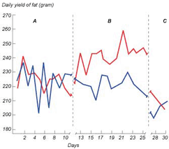 Содержание жира в молоке при машинном доении (синяя линия) и ручном доении (красная линия) передних сосков; А – оба передних соска подвергались машинному доению; В – один передний сосок подвергался ручному доению, а другой – машинному доению; С – оба передних соска снова подвергались машинному доению (четыре коровы) (Свеннерстен, Дж. Дэари Cци. 73:971, 1990 г.)