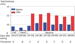 Измерение толщины кончика соска (Кутиметр) до и сразу же после доения при разных методах доения и пробные периоды (Хаманн и Станитске. Milchwissenschaft, 45:632 - 637, 1990 г.)