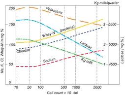 Патологические последствия мастита – повреждение тканей и изменение секреторной функции. Это приводит к уменьшению молочной продуктивности и изменению состава молока. Точно оценить потери в молочной продуктивности достаточно трудно, так как неинфицированные четверти вымени обычно компенсируют потери, вызванные болезнью инфицированной четверти. Механизм, регулирующий такую компенсацию, до сих пор не изучен. Изменение состава молока связано с уменьшением содержания жира и лактозы, при этом общий уровень протеина меняется незначительно, содержание серопротеинов увеличивается, а содержание казеинов уменьшается, что ухудшает качество молока как сырья для производства сыра. Концентрация ионов в молоке увеличивается, что приводит к увеличению его удельной проводимости (см. Картинка ниже).