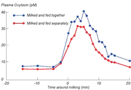 Любопытно то, что скармливание концентрата во время доения увеличивает и продлевает выделение гормона окситоцина, отвечающего за доение (см. Картинку ниже). С точки зрения молочной продуктивности, было также отмечено, что одновременное доение и кормление увеличивает молокоотдачу, сокращает время доения и способствует повышению молочной продуктивности. Сегодня проводятся дальнейшие исследования с целью определения оптимального времени кормления коровы во время доения. Когда необходимо это делать перед доением, во время или после?