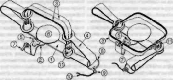 1 - станина; 2 - крестовина; 3 - дуги; 4 - пружина; 5 - рычаг насторожки; 6 - тарелочка; 7 - сторожок; 8 " кольцо вертлуга; 9 - вс-ртлуг; 10 - поводок; 11 - стойка