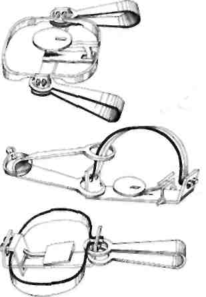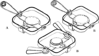 А - двухтарелочный капкан; В - двухтарелочный капкан, обшитый полотном; В - капкан с тарелочкой, помещенной в обойму