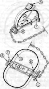 1 - пружина; 2 - рамка; 3 - дуга; 4 - на-сторожка; 5 - сторожок; 6 - стопорная серьга; 7 - хомут