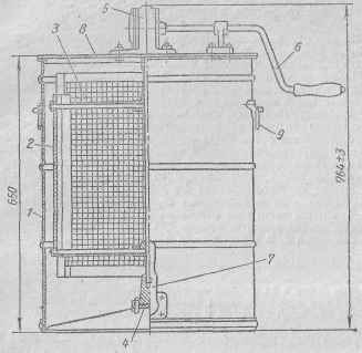 Медогонки хордиального типа. В хордиальных медогонках рамки для откачивания меда располагаются плоскостями по хорде (отчего они и получили свое название). Устроены они по одному принципу. Например, медогонка трехрамочная хордиальная (см. рисунок ниже) состоит из цилиндрического бака /, внутри которого вращается ротор 2. По окружности его на осях подвешены свободно поворачивающиеся кассеты 3. Передняя и задняя стенки прямоугольного каркаса каждой кассеты закрыты металлической сеткой, предохраняющей соты от разрушения. Ротор укреплен на двух подшипниках 4 в верхней и нижней частях бака. Приводится он во вращение с помощью привода 5 и рукоятки 6. В нижней части бака медогонки сделано отверстие для слива меда, плотно закрытое краном 7. Сверху бак прикрыт двумя полукрышками 8. В верхней части бака размещены ручки захвата 9.