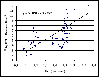 | КП 137Cs = -0,085K2O + 2,38 | R2 = 0,372 | КП90Sr = - 5,93рН + 39,87 | R2 = 0,397 |